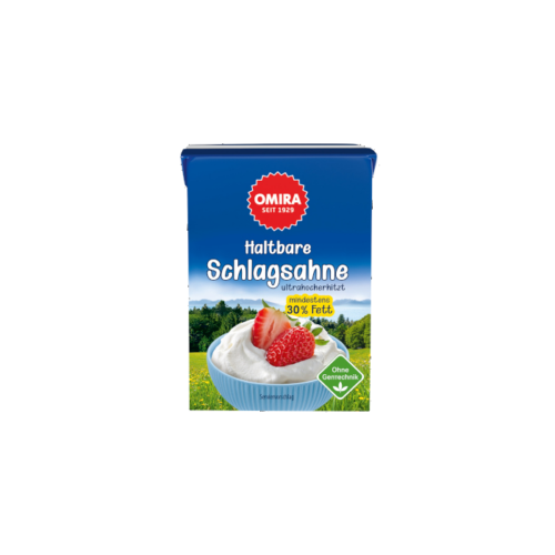 Für unsere OMIRA haltbare Schlagsahne verarbeiten wir beste Milch sehr sorgfältig durch schonende Behandlung zu Rahm mit 30 % Fett.